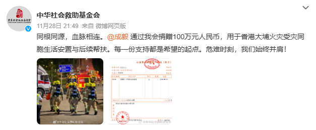 11月28日晚,中华社会救助基金会官方发文确认,@成毅通过该机构捐赠100万元人民币,款项专项用于香港大埔火灾受灾同胞的生活安置与后续帮扶。