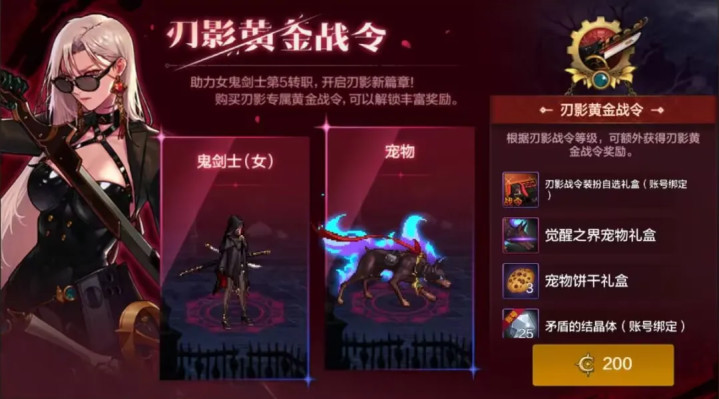一个是“刃影战令”,售价200点券,只有刃影可入手,通过升级可解锁时装、矛盾结晶体、界宠物、宠物饼干等道具。