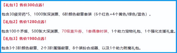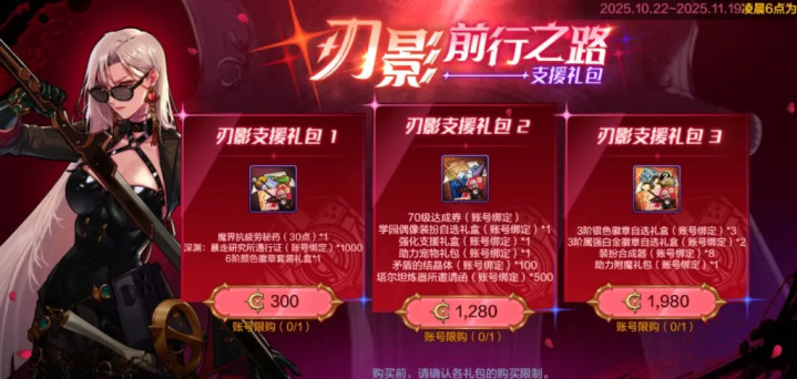 另一个是“支援礼包”,有3种款式可供选择,主要是用于加速刃影毕业打造的道具,具体内容如下: