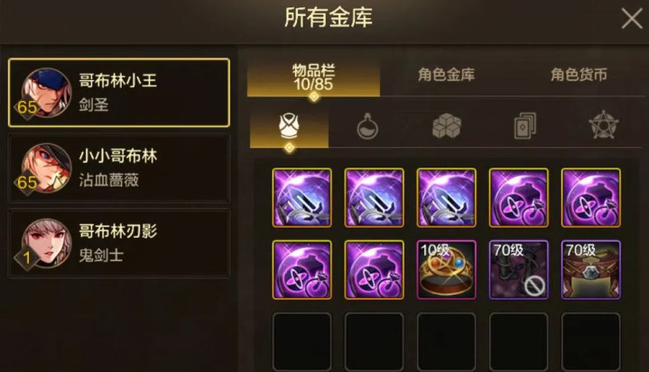 其次增加了“所有金库”的选项,可以很直观看到其他角色背包或金库中的道具、货币等信息;