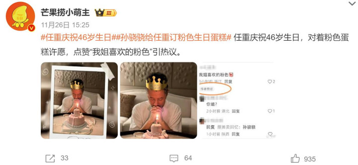有网友在他的生日动态下留言“这蛋糕一看就是我姐喜欢的粉色”。