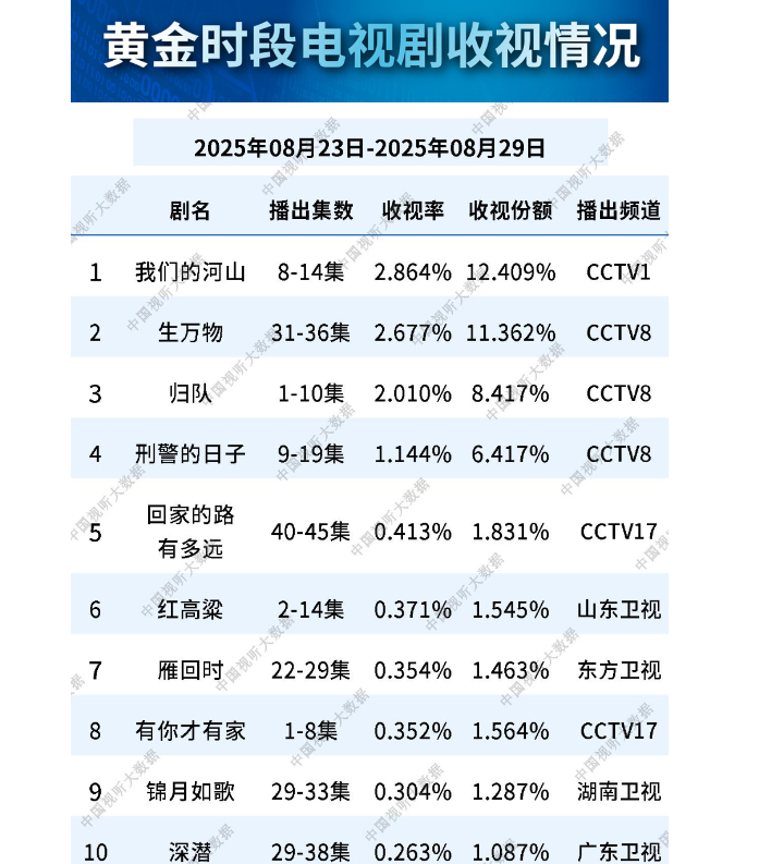 这不,眼下总局已经发布了8月23日至8月29日黄金时段的电视剧收视情况。